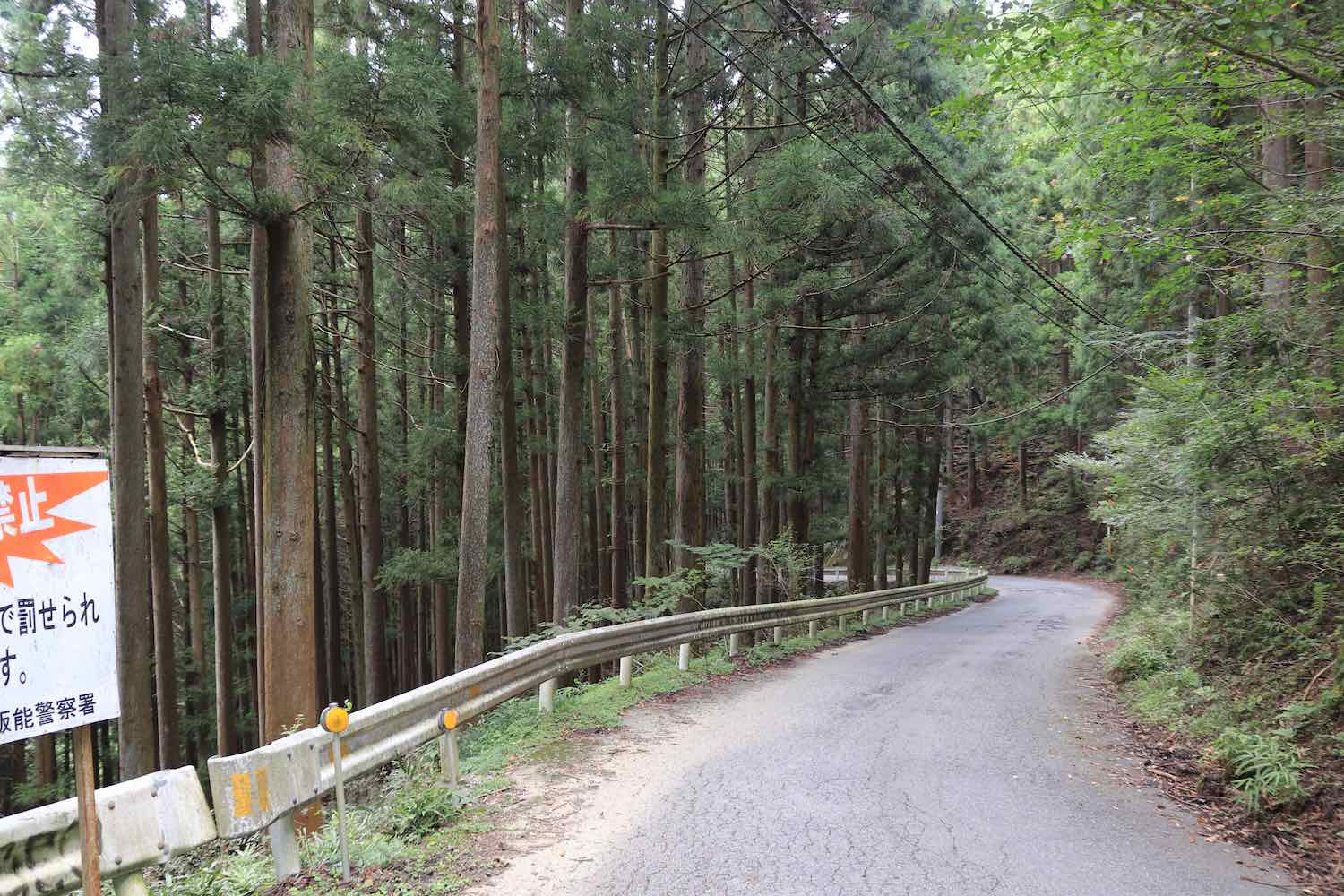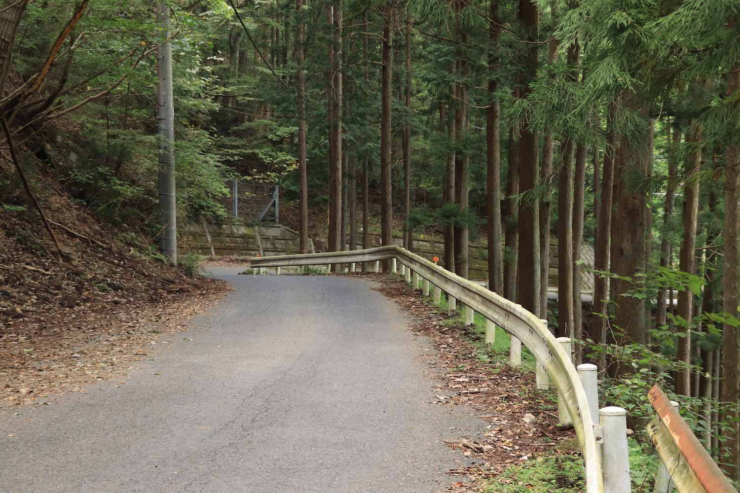 通ってきた道を振り返るとこのような光景である.道のひび割れ,ガードレールの古さ,幅員の狭さなどが味わい深い.また,どこまでも杉林が続いているのも印象的である.広大な山中に植林をしてきた林業従事者に思いを馳せた.
