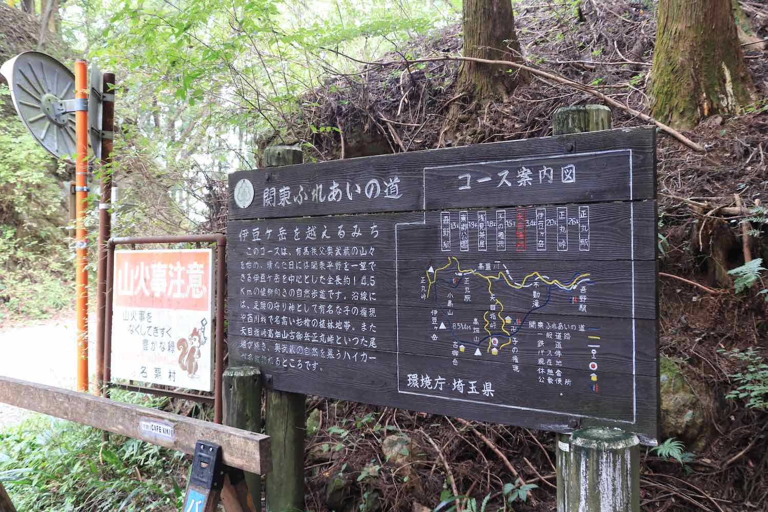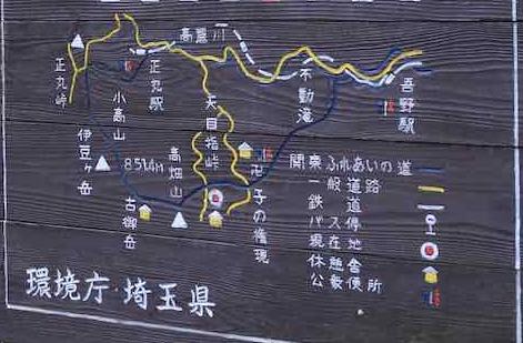 近くにはこのような「関東ふれあいの道」の案内看板もある.看板によれば,この天目指峠を通過する「伊豆ヶ岳を越えるみち」は,このあたりの尾根筋を通って,子の権現や正丸峠などを結ぶ道のようである.