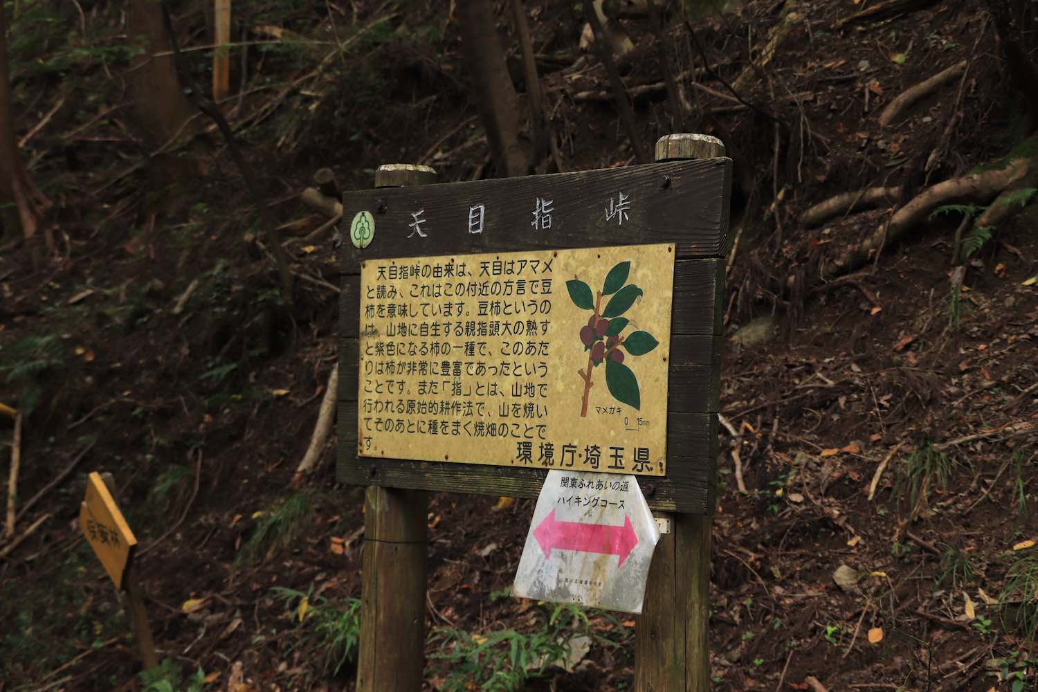 峠の北側すぐのところには,このような看板があった.このタイプの看板は,飯能市内のハイキングコースなどでよく見る気がする.これも「環境庁」とあるから,約20年以上はここにあり続けていることが分かる.