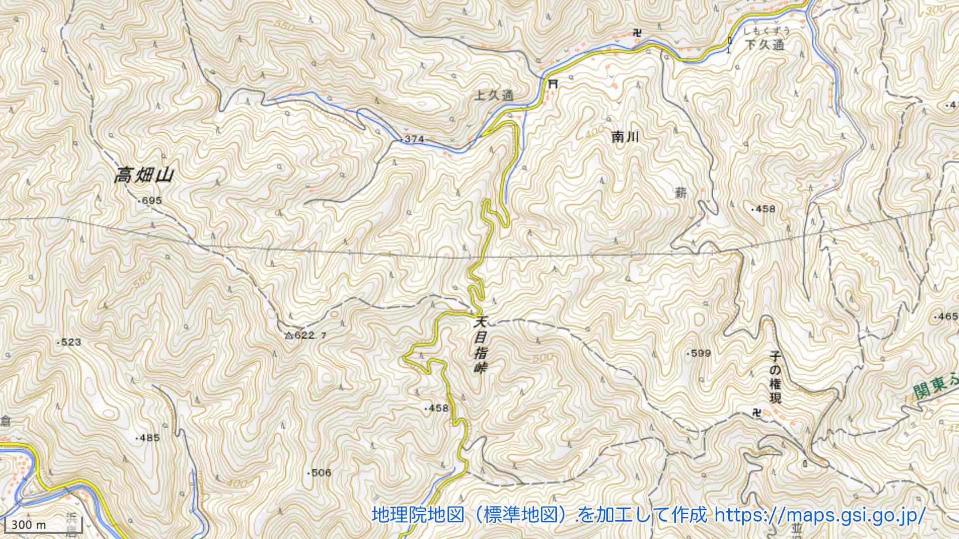 県道以外の道にも注目してみる.まず,天目指峠を東西に貫く点線の道があるが,これは前回にも登場した,「関東ふれあいの道『伊豆ヶ岳を越えるみち』」を構成する尾根伝いの山道である.西へ進めば高畑山という山,東へ進めば子の権現という寺院に到達することが分かる.