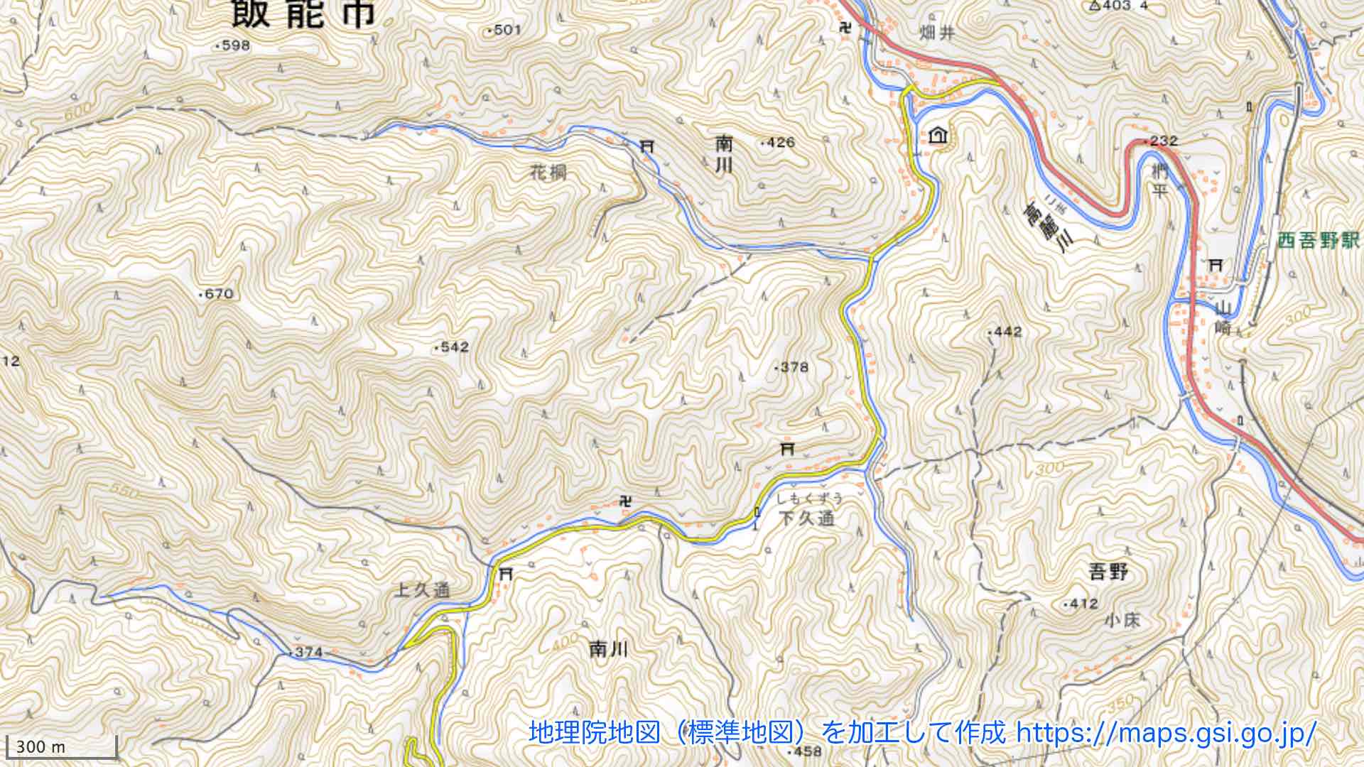さらに下流側の地形図も見てみよう.峠の南側とは違って,民家が始まってから国道299号線に到達するまでが長く,また途中には何ヶ所も車道が分岐する箇所がある.そのうち,寺院の地図記号の近くで南に分かれて行く道は,子の権現に至る林道である.神社や寺院,墓地などの地図記号も散見される.沿道の地名は,「上久通」「下久通(しもくずう)」の他に,「南川」が2箇所に見られる.高麗川の南という意味と,その支流である県道沿いの川(久通川という名前と思われるので以後そう呼ぶ)の南という意味と,両方が想像される.