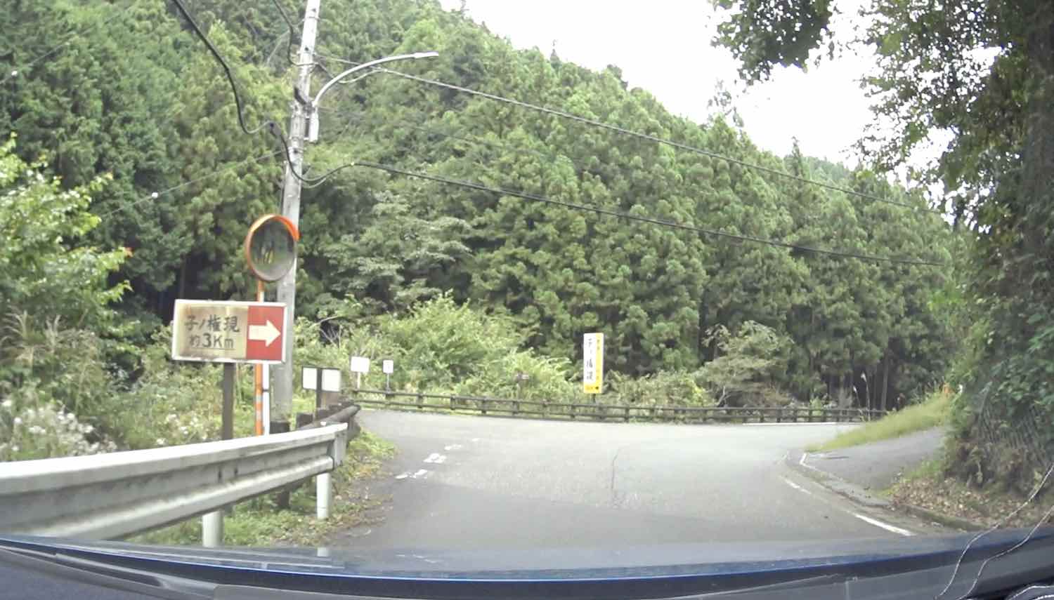 これが,上久通林道との分岐点,かつてのバスの折り返し所の景色である.正面は行き止まりの林道,県道は右手前方向である.