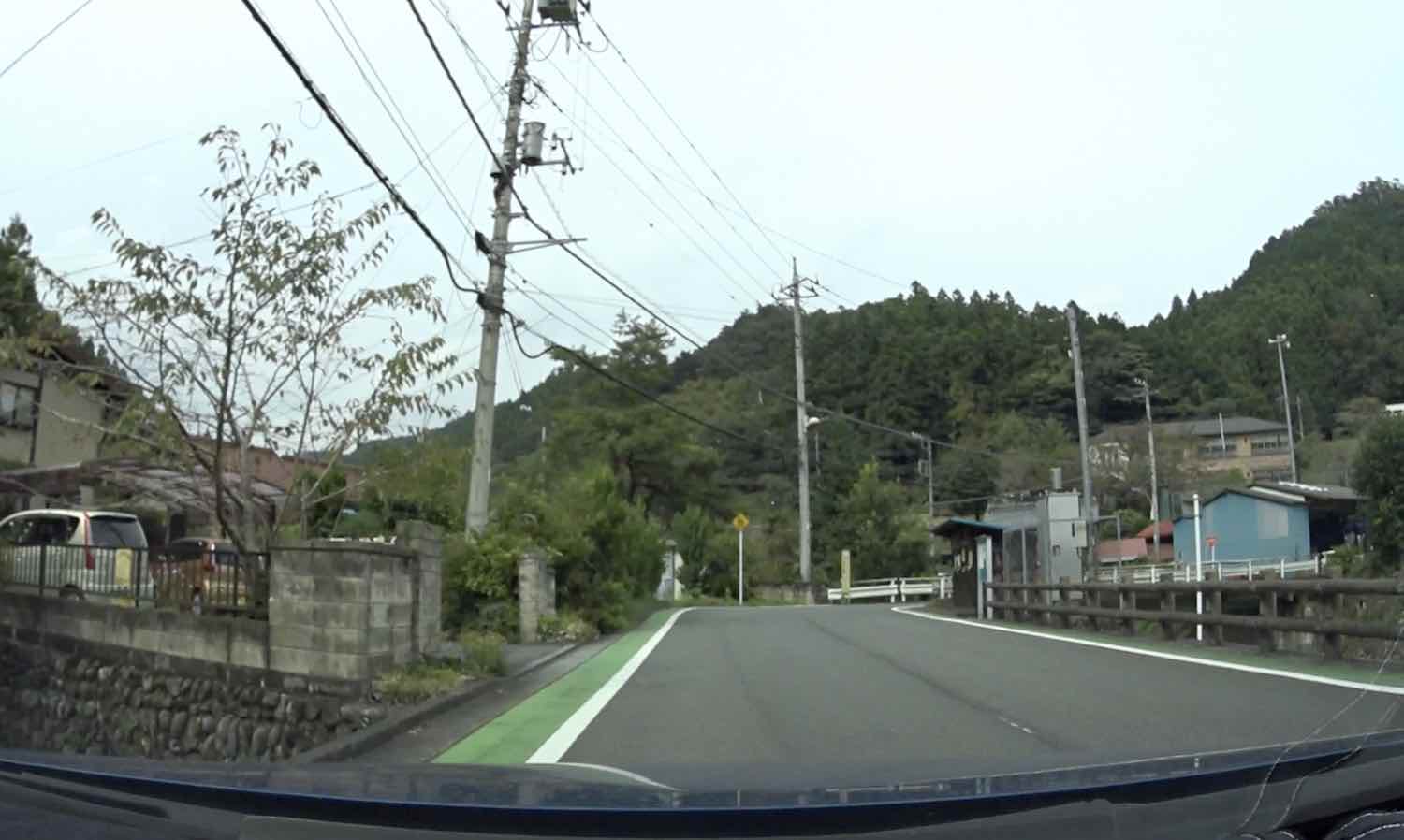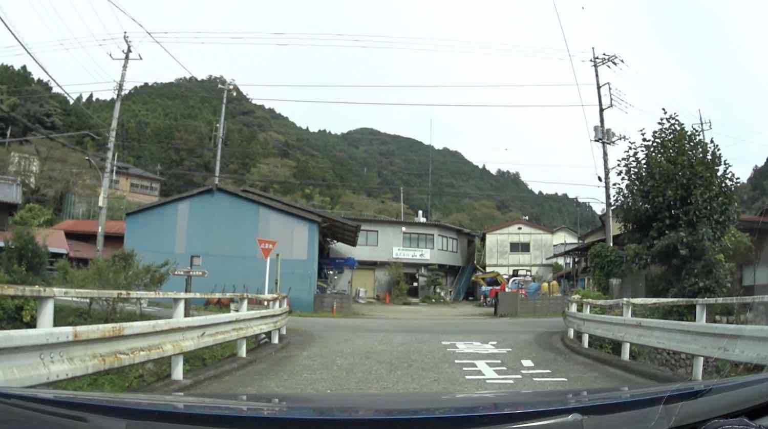 その少し先でこのように沢を渡り,ここからは左岸側を進む.その後も県道は同じくらいの道幅で川に沿って進み,途中民家があったりそれが途切れたり,また左右から何本かの道が現れたりする.
