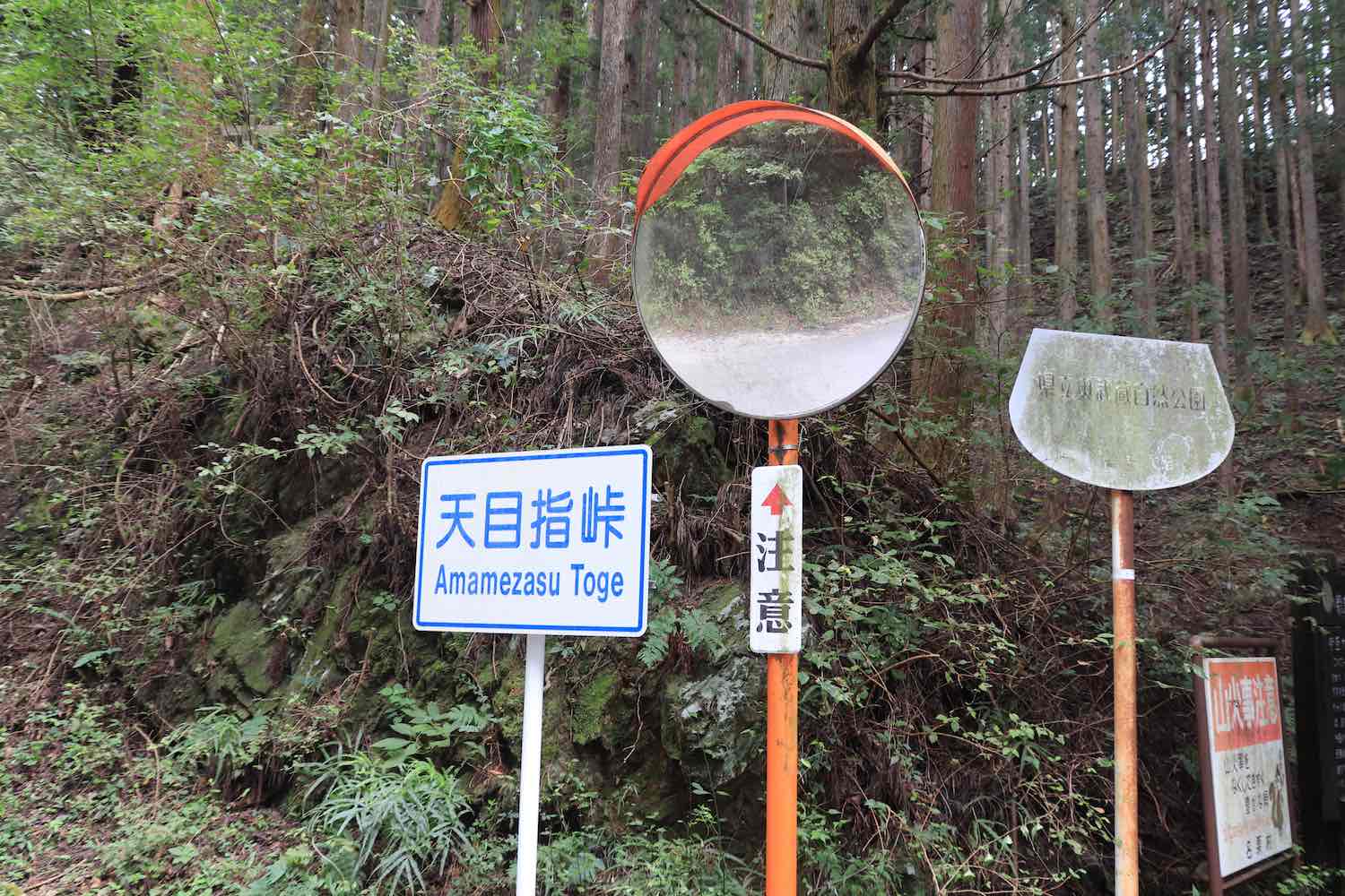 峠の標識である.ローマ字併記のおかげで,たしかに「あまめざす」と読むのだと再確認できた.また,右には「県立奥武蔵自然公園」の古びた標識がある.埼玉県のホームページによると,飯能市,日高市,入間市にまたがる21,839.0ヘクタールもの範囲がこの自然公園として指定されており,指定年月日は昭和26年3月9日ということである.もしかしたら昭和26年からずっと立っている看板なのかもしれない(標識をもっとよく見ればいつのものか判明したかもしれない).