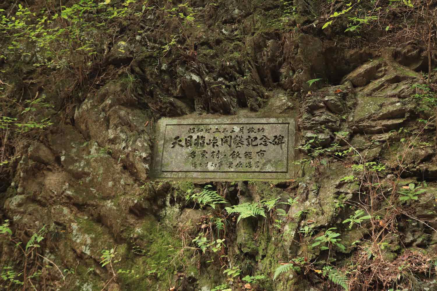切り通しの西側斜面には,このような「天目指峠開鑿記念碑」がある.「昭和卅五(35)年三月竣功」と書いてあるが,それ以前にここにどのような道が存在していたのかは現地では分からなかった.また,「名栗村・飯能市」とあることから,当時はここが名栗村と飯能市の境であったことがうかがえる.これを揮毫した栗原浩という人物は,1956年から1972年まで埼玉県知事を務めた政治家である.