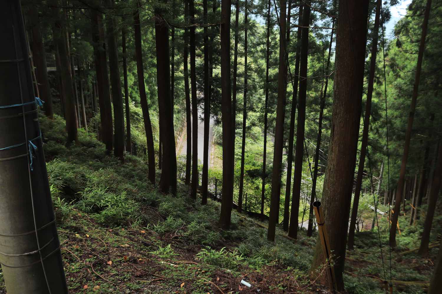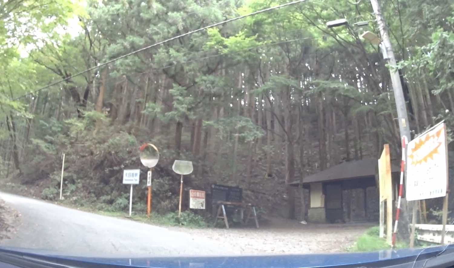 通ってきた道を振り返るとこのような光景である.道のひび割れ,ガードレールの古さ,幅員の狭さなどが味わい深い.また,どこまでも杉林が続いているのも印象的である.広大な山中に植林をしてきた林業従事者に思いを馳せた.